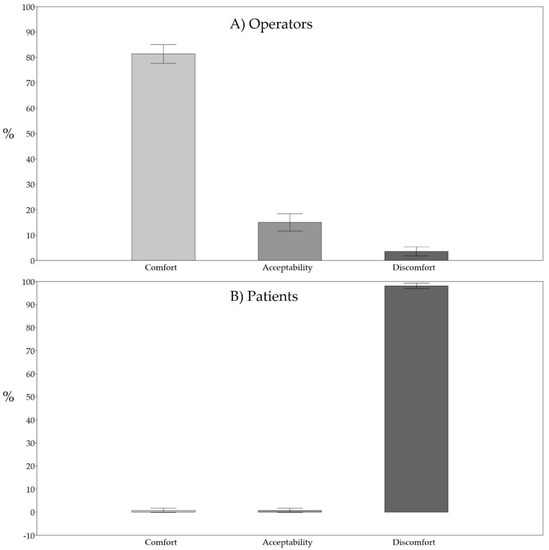 Values and 95% confidence intervals of thermal comfort, acceptability and discomfort for operators (A) and patients (B).