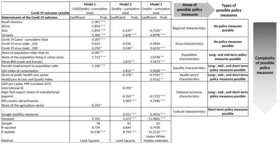 As with any study, the limitations have to be considered for proper interpretation of the results. In this study, limitations arise from two perspectives: the data and the methods. Although we have taken unified data sources across countries, we found inconsistencies in their data collection approaches, e.g., number of deaths due to COVID-19 is not uniquely defined across countries. Further, the data availability was limited in the sense that for an individual variable for some countries there were missing values. Consequently, it has led to the trade-off between a larger number of variables or a larger number of included countries. The results are thus impacted by the choice we made in this perspective and might differ from models, where we would either include fewer explanatory variables but even more countries or contrary, more explanatory variables, and fewer countries. Further, regarding the study design, standard testing of policy impact (e.g., treatment effect models, but also Granger causality test) was according to the nature, quality, and availability of data not possible to apply. Additionally, because the pandemic and the applied measures have not yet come to an end, other econometric approaches as what we went for did not seem reasonable in our case. Again, we tried to make the study as broad as possible (in the number of countries included and in the range of variables included), which also impacted the possibilities of applied econometric approaches.