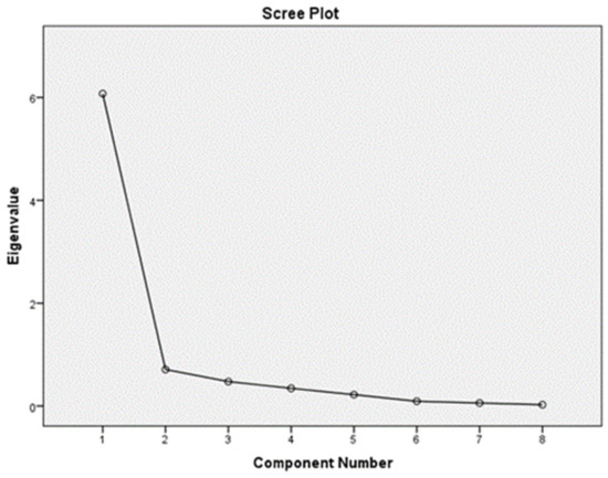 EFA of the principal components of the GCPS 2.0 with Oblimin rotation method identified one factor with seven items (factor loading: 0.681–0.918) corresponding to an eigenvalue of 6.07. The Kaiser-Meyer-Olkin measure of sampling adequacy of 0.88 was higher than the recommended value of 0.60, and the results of Bartlett’s test were significant (chi-squared = 2179.59, df = 28, p < 0.001), indicating the adequacy of the data for performing principal components analysis. A scree plot was drawn to support the 1-factor structure (Figure 1), which explained the total variance of 75.92%.