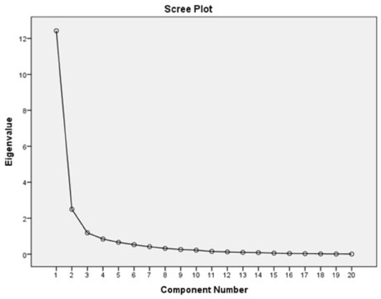 On the other hand, EFA of the principal components of the JFLS-20 with Oblimin rotation method showed that the Kaiser-Meyer-Olkin coefficient was good (0.85), indicating sample adequacy, and Bartlett’s test of sphericity was significant (Chi-square= 6718.92, df = 190; p < 0.001), confirming the adequacy of the data for factor analysis. A 3-factor structure; “Mastication” (item 1–5, 7–8, 12, 14–15, 20) with factor loading 0.412–0.995, “Vertical jaw mobility” (item 9–10, 13) with factor loading 0.430–0.543, and “Verbal and non-verbal communication” (item 6, 11, 16–9) with factor loading 0.591–0.964 were identified with an explained total variance of 80.54% supported by a scree plot (Figure 2).