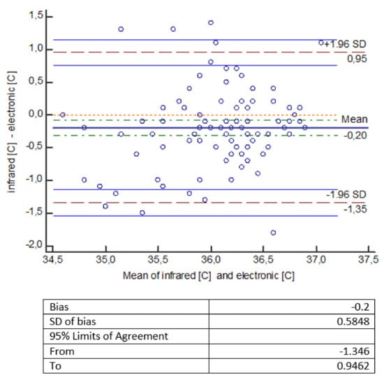 In another analysis presented in the graph (Figure 2) by Bland–Altman, it was indicated that a mercury-free thermometer gives higher results than an infrared thermometer on average by 0.35 °C (the line for the mean difference is 0.35 lower than the absolute correspondence illustrated by the line of level 0). The range of the compliance interval is 2.57 °C.