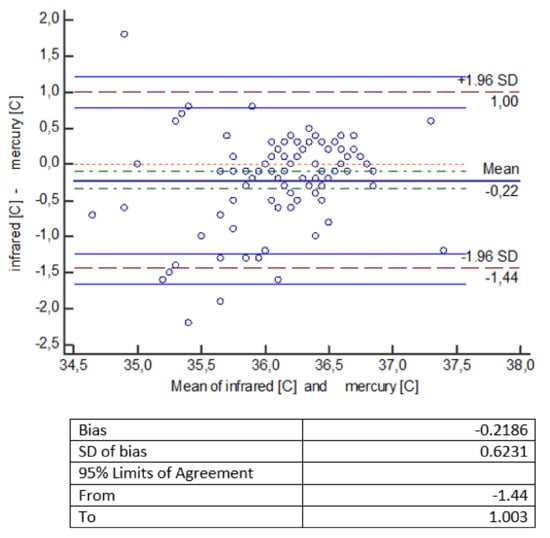 The statistical analysis of the measurements shows that temperature measurements made with an infrared thermometer give statistically significantly lower values compared to temperature measurements made with other thermometers (mercury, mercury-free, electronic). The error of measurement methods should be considered a bit more broadly. It consists of a systematic error, largely dependent on the measuring device (which we mentioned in the introduction), and a random error, which is the standard deviation here. Small and comparable in all types of measurements made by us, the value of the random error indicates a well-planned and scrupulously conducted experiment. To facilitate the interpretation of the results, a Bland-Altman diagram was used, showing the degree of compatibility between two different samples—to estimate the 95% reproducibility coefficient. ‘Mean’ on the graph is the average of the differences. If the results obtained by two methods differ from each other, then there is a shift, called bias, and then the line showing the average of the differences is not at the level of 0, but is shifted significantly up or down from this level. The chart shows a 95% compatibility interval. If the differences are normally distributed, 95% of the differences will be in the range (mean of differences ± 1.96 SD), where SD is the standard deviation of the differences. Thus, the defined compliance interval is not the same as the confidence interval.