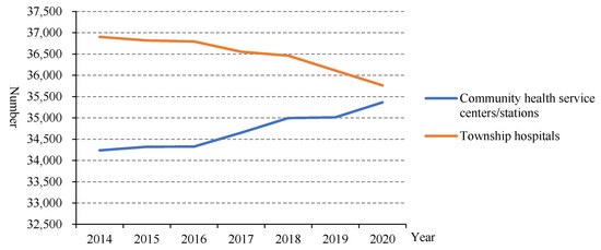 The number of community health service centres/stations increased from 34,238 in 2014 to 35,365 in 2020, while the number of township health centres decreased from 36,902 in 2014 to 35,762 in 2020 (Figure 1).