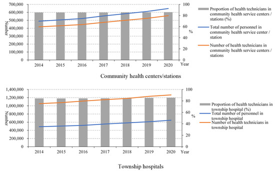 From 2014 to 2020, the total number of personnel and the number of health technicians in community health centres/stations both increased (Figure 2). The proportion of health technicians accounting for the total number of personnel in community health centres/stations remained almost unchanged before 2020 and increased slightly in 2020 (86.12%) compared to 2014 (85.42%). Similarly, the total number of personnel and the number of health technicians in township hospitals also increased, and the proportion of health technicians accounting for the total number of personnel in township hospitals remained almost unchanged before 2020, and increased slightly to 85.55% in 2020 compared to 84.45% in 2014.