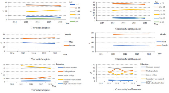 From Figure 3, we can see that the number of health technicians younger than 45 years old was reduced, and the proportion of male health technicians in PHIs, including community health centres and township hospitals, also showed a decreasing trend, while the proportion of females increased. Moreover, most health technicians (~60%) had an education level lower than undergraduate.
