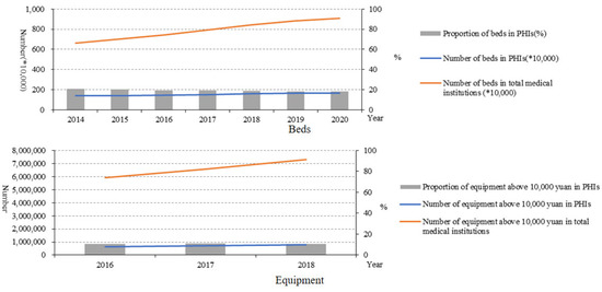 Although the number of beds in PHIs also increased to 164.94 × 104 in 2020 from 138.12 × 104 in 2014, the proportion of beds in PHIs accounting for the total number of beds in medical institutions decreased from 20.92% in 2014 to 18.12% in 2020. The equipment valued above 10,000 RMB showed a similar trend with beds in the number and proportion (Figure 4).