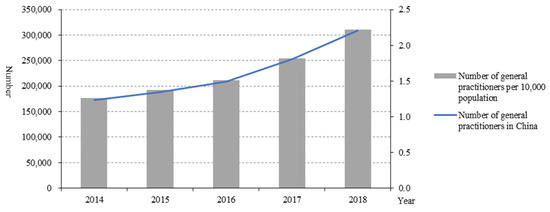 The number of general practitioners in China increased from 172,597 in 2014 to 308,740 in 2018 (Figure 5), as did the number of general practitioners per 10,000 people (1.26 in 2014 to 2.22 in 2018).