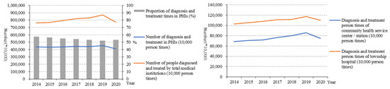 From 2014 to 2019 (Figure 6), the number of diagnoses and treatment times by total medical institutions increased from 760,186.6 (10,000 person-times) to 872,000 (10,000 person-times), but it decreased to 774,000 (10,000 person-times) in 2020. For PHIs, the number of diagnoses and treatment declined from 453,087.1 (10,000 person-times) to 412,000 (10,000 person-times). Among PHIs, the number of diagnoses and treatment times in township hospitals was much higher than that of community health centres.