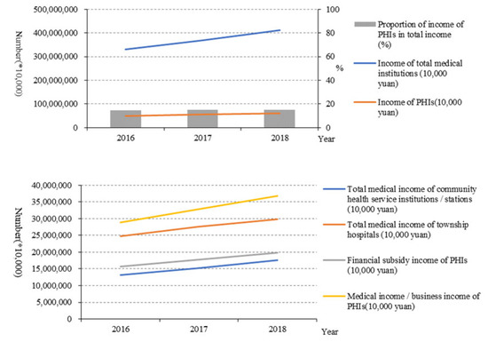 From 2016 to 2018, the income of PHIs increased from 48,293,753 (10,000 yuan) to 61,246,366 (10,000 yuan), and the proportion of the income of PHIs accounting for the total income in medical institutions increased slightly from 14.56% to 14.9%. Among PHIs, the income in township hospitals was higher than that of community health centres. Moreover, the medical income in PHIs was much higher than government subsidies (Figure 7).