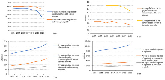 Figure 8 shows that the utilisation of beds in township hospitals was also higher than that of community health centres. However, both showed a decreasing trend during 2014 and 2020. The bed days per doctor’s service also had a similar trend. The medical expenses per patient in PHIs were much lower than those of general medical institutions, and compared with community health centres, they were lower in township hospitals. However, the medical expenses per patient in PHIs increased in the last six years.