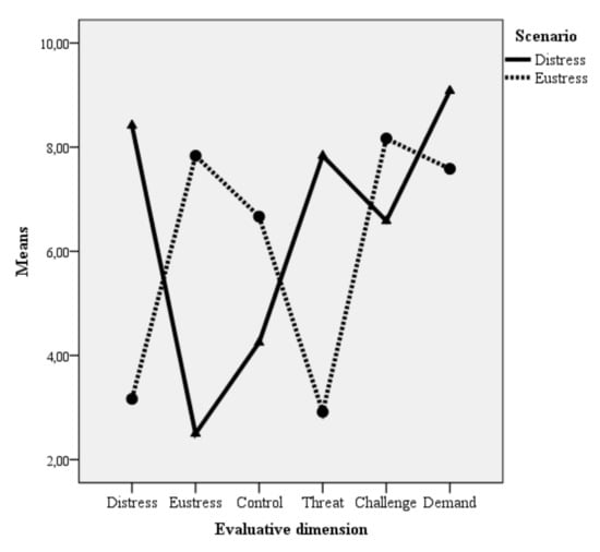 The distinction in the remaining paired scenario reflected two common types of intragroup conflict as discussed in the literature, namely task conflict (i.e., disagreements about the task) and relationship conflict (i.e., interpersonal frictions) []. Intragroup conflict is a stressful event, yet task and relationship conflict are two qualitatively different stressors []. The eustress scenario of intragroup conflict represented a situation in which the focal person experienced task conflicts, which were uneasy at times but held the potential to improve the group performance (i.e., a reasonable amount of control). In contrast, the distress scenario placed respondents in a situation of relationship conflict, which was interpersonal in nature and interfered with effective group work. The results pointed to the situations describing conflicts related to group work as discriminative with respect to the eustress/distress dimension. We used a mixed model ANOVA with the eustress/distress evaluation as a within-subject factor and the type of scenario as a between-subject factor, and the results showed a significant interaction effect between the within- and the between-subject factors, F(1, 16) = 9.01, p = 0.008, η² = 0.36 (the observed power was π = 0.80), illustrative of the discriminative nature of the two scenarios. With respect to the other evaluative dimensions, the task conflict scenario was perceived to have a higher degree of control, F(1, 16) = 6.49, p = 0.02, η² = 0.29 (the observed power was π = 0.67), and to be less threatening, F(1, 16) = 12.67, p = 0.003, η² = 0.44 (the observed power was π = 0.91), than the relationship conflict scenario. The results for perceived challenge and amount of demand, however, did not clearly differentiate the two scenarios. Based on these results and on the basis of the respondents’ feedback (e.g., the distress scenario was not too stressful and some still felt in control), we made small adjustments to the texts to increase the discriminative nature of the scenarios (i.e., reducing the amount of challenge and control and increasing the demands present in the distress scenario). The adjusted pair of scenarios that was used for the validation study is presented in the Supplementary Materials. Because we planned to carry out the actual scale validation study in a different cultural context, we cross-validated the adjusted pair of scenarios by asking 12 students enrolled at a large Romanian university to evaluate the two adjusted scenarios on the same six dimensions as in the preliminary phase. The results of the cross-validation fully fitted our expectations, namely that the distress scenario scored high on distress, threat, and demand, while the eustress scenario scored high on eustress, challenge, and control. The results are presented in Figure 1.
