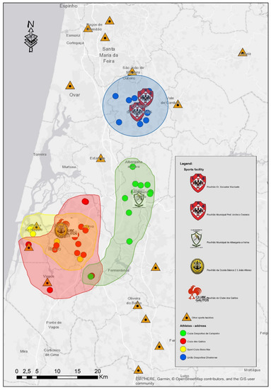 Still, for certain cases, the proximity of the sports facilities was not always a reason to choose the club in the place they live, having predominated other reasons to choose a club that is further away, such as having friends practicing the sport in that club. Moreover, it was possible to verify that the catchment area of Campinho and Galitos is larger than that of the other clubs (Figure 2).