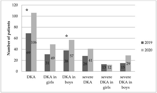 Figure 1. Number of DKA and severe DKA in children in 2019 and 2020. *—p < 0.05.