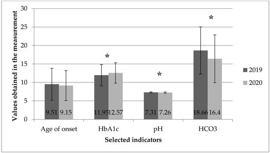 Figure 2. Mean values and standard deviation of the parameters of children at the time of clinical diagnosis of T1D: age, HbA1c, pH, HCO3 in 2019 and 2020. *—p < 0.05.