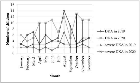 Figure 3. The number of DKA and severe DKA in children in 2019 and 2020 by month.