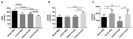 We measured antioxidant capacity (BAP) and the levels of oxidative species (d-ROM) from all the participants, and the results are reported in Figure 1. In a detailed analysis of antioxidant capacity (Figure 1A), we found a significant increase (25.2%, p < 0.001; η2 = 0.655) in the male basketball players compared to the male control group, and the BAP mean value was 2153.14 ± 211 µmol/L for the athletes in comparison with the controls (1720.33 ± 216 µmol/L). Moreover, a significant increase (21.7%, p < 0.001; η2 = 0.655) was observed in the female basketball players (1764.7 ± 163 µmol/L) compared to the female control group (1450 ± 139 µmol/L).