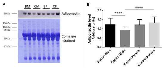 Plasma adiponectin levels. (A) A representative immunoblot of adiponectin with the corresponding Coomassie-stained PVDF membrane. (B) Relative quantification of adiponectin carried out by the Image J program. Female data are from Militello et al., 2021. Statistical analysis was performed by two-way ANOVA (Tukey’s multiple comparisons test) using GraphPad Prism 8. Bars represent the mean ± SD (n = 10; **** p < 0.0001).