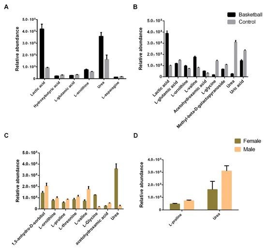 With respect to the non-athlete subjects, we found that only L-proline (154%, p = 0.0021; η2 = 0.911) and urea (191%, p = 0.0201; η2 = 0.928) were differentially concentrated, and both were more abundant in males.