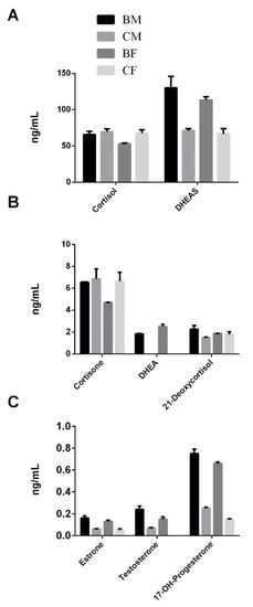 Measurements of steroid hormones quantified in the plasma of both male and female basketball players vs their respective controls. The histogram representations were separated in three panels (A–C) in agreement with the order of magnitude expressed in ng/mL. The statistical analysis was carried out by two-tailed t-test using GraphPad Prism 8, and only statistically significant differences were reported (p < 0.05).
