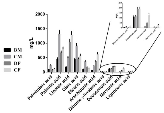 Our results showed that there was a general trend of the identified fatty acids to decrease with physical activity, independent of sex. In particular, palmitoleic acid (36% for males, p = 0.0001; 65%, p = 0.0369 for females; η2 = 0.9680), palmitic acid (34% for males p = 0.001; 84% for females, p = 0.003; η2 = 0.9533), linoleic acid (35%, p = 0.0084 for males; 80%, p = 0.0332 for females; η2 = 0.9742), oleic acid (48% for males, p = 0.0001; 78%, p = 0.0157 for females; η2 = 0.9343), arachidonic acid (26%, p = 0.0047 for males; 59%, p = 0.0001 for females; η2 = 0.9788), dihomo γ-linolenic acid (41%, p = 0.0001 for males; 14%, p = 0.0001 for females; η2 = 0.9764), 15-tetracosenoic (nervonic) acid (39% for females), and tetracosanoic (lignoceric) acid (30% for females) decreased in both female and male basketball players compared to the control groups (p ≤ 0.05; Figure 5). Even two C24 fatty acids, e.g., 15-tetracosenoic (nervonic) acid and tetracosanoic (lignoceric) acid, decreased because of the physical activity to concentrations lower than the limit of instrumental detection in the male basketball players group. Interestingly, docosenoic acid was slightly more abundant in females than males, but it did not change in relation to sport (Figure 5), and stearic acid exhibited a different tendency in relation to physical activity and sex; in fact, it decreased in the male basketball players (26%, p = 0.0001; η2 = 0.9714) but increased in the female athletes (131%, p = 0.132; η2 = 0.9714) (Figure 5).
