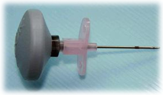 The Cook Dieckmannn intraosseous needle is composed of a thick metal needle in the shape of a pyramid for adults and a pencil-shaped needle for children and infants (Figure 1). Apart from the needle, it has a sear and a handle, which allows us to exert force on it to cross the cortex of the bone and access its interior. This needle has a black mark located 1 cm from the tip of the catheter, which will be the visual reference point. The needle is inserted perpendicular to the joint. The insertion of this type of needle is carried out by pressure, with a slight rotational movement to penetrate the cortex of the adult patient [1,2,3].