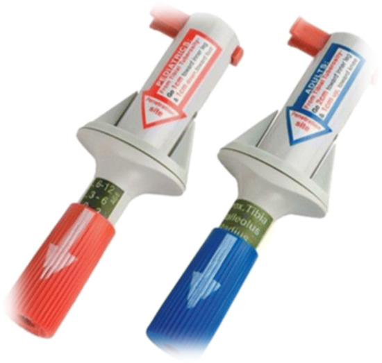 The intraosseous infusion gun, or Bone Injection Gun (BIG), is for single use (Figure 3). It consists of a spring, a trigger that fires the pre-assembled catheter, and a compact system with a safety pin. This device can be used in hard cortical bones, but the length of the needle can be conditioned due to the variability of the thickness of the chosen puncture site [1].