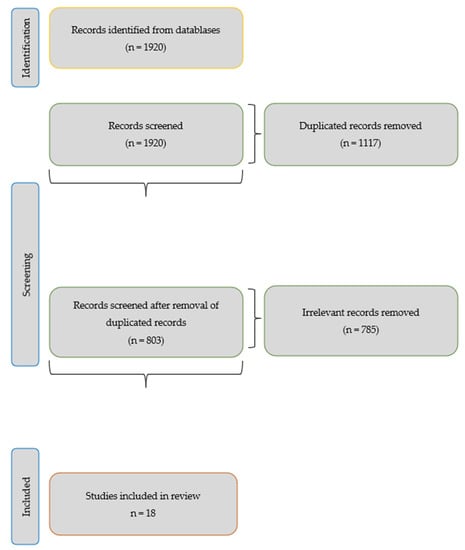 Below is a table that shows the search strategy used to select the 18 articles selected from the 6 databases, following the criteria of identified studies, duplicate studies, title, abstract, full text, and valid studies of a definitive nature (Table 1). The total number of valid articles is summarized in Appendix A.