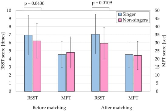 Of the enrolled 196 subjects, we classified two groups of singers and non-singers based on having at least one year of singing experience. The numbers in each group were unbalanced. Taken together, propensity score matching (PSM) [,] was used to adjust for gender, age, BMI and grip strength (Table 3: before matching). A comparison of MPT in groups with and without aspiration has been reported previously, showing MPT in the group with aspiration was significantly shorter in the group without aspiration []. It was suggested that a decline of phonatory functions could be a risk factor for aspiration. Therefore, the MPT data were excluded as a matching factor due to their high likelihood of modifying RSST. The criteria used in our matching procedure were based on variables considered to be important determinants and predictors of swallowing ability, which were matched by gender, age, BMI, and grip strength. A 1:1 nearest neighbor within the caliper was defined as the matching allowable area [], with an initial caliper coefficient of 0.2 and a caliper value of 0.143. Two cases were rejected, while 53 were accepted. The final study population included 106 case-control pairs, with 53 subjects each in the singer group and the non-singer group. Categorical gender comparisons were performed using Pearson’s chi-squared test, while continuous variables (age, BMI and grip strength) were compared using the t-test. The p-values for gender, age, BMI, and grip strength after matching were larger than those measured before matching. The standardized difference allowed us to identify differences in the range and mean. Statistical significance was measured using an unpaired t-test for RSST and MPT between singers and non-singers.