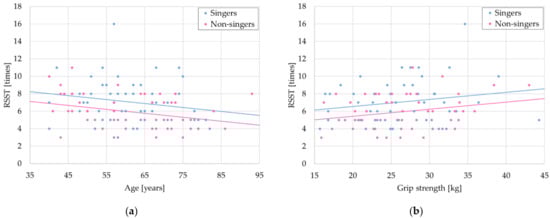 ANCOVA of RSST score: (a) ANCOVA of age plotted as a function of RSST score, RSST = −0.045 × Age + 9.837 − 1.122× Group (Singers: Group = 0, Non-singers: Group = 1, p = 0.0084); (b) ANCOVA of grip strength plotted as a function of RSST score, RSST = 0.081 × Grip strength + 4.931 − 1.124 × Group (Singers: Group = 0, Non-singers: Group = 1, p = 0.0089).
