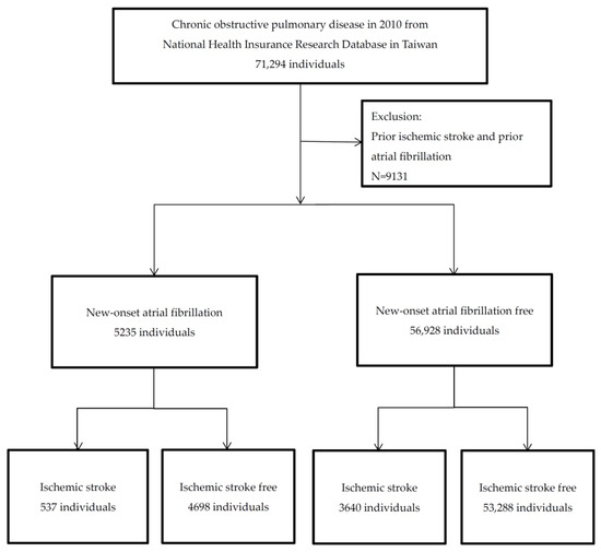 This study used the inpatient dataset including 5 diagnostics plus 5 operational codes. The duration of the study was from 1 January 2010 to 31 December 2010. The first admission for COPD was retrieved via International Classification of Disease, Ninth Revision; Clinical Modification (ICD-9-CM) codes 491, 492, and 496. AF was determined through the ICD-9-CM code 427.3x. Patients who experienced AF during the same admission or after COPD hospitalization were discharged and defined as new-onset AF. The events of IS were defined as ICD-9-CM codes 433–437. The exclusion criteria were prior IS and prior AF before COPD admission. The comorbid conditions, as assessed by ICD-9-CM codes, included hypertension (401–405), diabetes mellitus (250), coronary heart disease (410–414), congestive heart failure (428), hyperlipidemia (272), chronic kidney disease stages 2–4 (582–584, 588), end-stage renal disease (585,586), sepsis (038, 003.1, 036.1), peripheral artery disease (443), anemia (285), and alcoholism (291,303).
