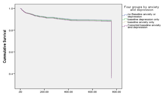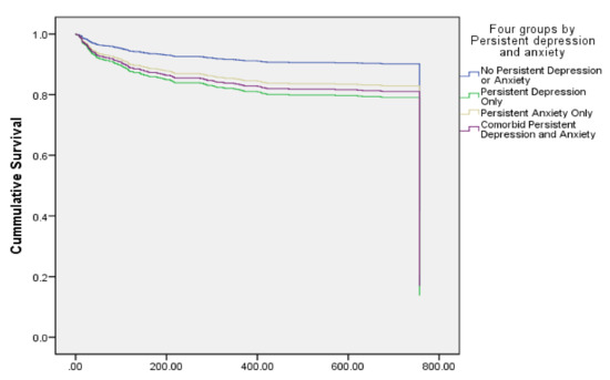 In the second block, clinical variables (i.e., smoking history, BMI, HTN, and DM) were entered. Secondary education level compared to primary educational level (HR 0.60; 95% CI: 0.41–0.89; p = 0.011) and college or more education level compared to primary educational level (HR 0.45; 95% CI: 0.26–0.81; p = 0.007) remained the only significant predictors of second ACS event. In the final block, depression and anxiety group was entered into the model. The final model demonstrated that secondary education level compared to primary educational level (HR 0.63; 95% CI: 0.43–0.93; p = 0.020), college or more education level compared to primary educational level (HR 0.47; 95% CI: 0.27–0.84; p = 0.011), persistent depression only (HR 2.27; 95% CI: 1.35–3.81; p = 0.002), and comorbid persistent depression and anxiety (HR 2.03; 95% CI: 1.03–3.98; p = 0.040) were the significant predictors of second ACS event. Patients with persistent depression are 2.27 times more likely to have a second ACS event compared to those who do not have persistent depression or anxiety. In addition, patients with comorbid persistent depression and anxiety are 2.03 times more times more likely to have a second ACS event compared to those who do not have persistent depression or anxiety (Table 2, Figure 1).