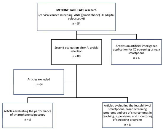 A literature search was conducted on MEDLINE and LILACS, selecting English- and French-written studies published between January 2015 and November 2021. Terms used for research were: (cervical cancer screening) and ((smartphone) or (digital colposcopy)). Articles were excluded from the title, abstract, and/or methodology: (i) if they had not been conducted in a cervical cancer screening context using D-VIA, (ii) if they did not include the use of smartphones for D-VIA image acquisition, (iii) if the study was not conducted in a low-resource setting or low and middle income countries (LMICs), and (iv) if the study data were not published in full articles. Specific MeSH terms (VIA, D-VIA, LMICs) were voluntarily not used because it limited greatly the number of results. Research period was chosen arbitrarily to overview most recent data. We also summarized the articles published on artificial intelligence (AI) according to our research for cervical pre-cancer identification. These studies were not necessarily conducted in low-resource settings considering that AI could be used in the near future in LMICs (Figure 1). Reference lists of identified papers were also reviewed to ensure that all studies meeting our inclusion criteria were considered. Two reviewers independently assessed each article for eligibility.
