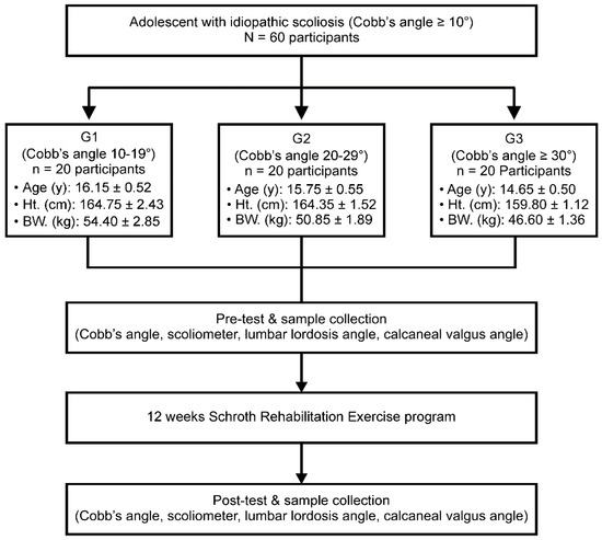 Inspection processes and procedures. G1, mild idiopathic scoliosis group with a Cobb’s angle of 10–19° (n = 20); G2, moderate idiopathic scoliosis group with a Cobb’s angle of 20–29° (n = 20); G3, severe idiopathic scoliosis group with a Cobb’s angle of ≥30° (n = 20); Ht., height; BW., bodyweight.