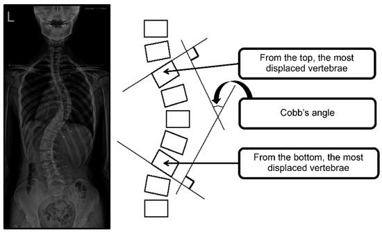 The Cobb’s angle was measured radiographically by a rehabilitation medicine doctor. The angle between intersecting lines drawn perpendicular to the top of the top vertebrae and the bottom of the bottom vertebrae is the Cobb’s angle, as shown in Figure 2. The calculated angle determines the curvature severity [29].