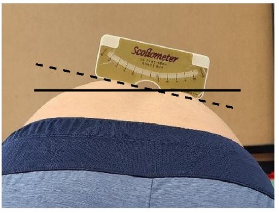 To perform Adam’s forward bending test, each participant was asked to stand with their feet together, naturally relaxing both arms and hands and bending the upper body forward at 90°. The examiner stood with the participant’s back at eye level and measured the asymmetrical thoracic and lumbar rotation angles through the rib hump using a scoliometer (National Scoliosis Foundation, Watertown, MA, USA) [30]. Measurements were carried out as shown in Figure 3.