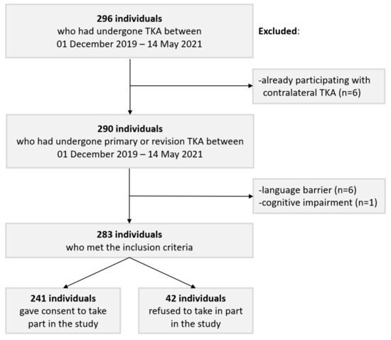 After excluding individuals with a language barrier (n = 6), cognitive impairment (n = 1), and those already participating in the study with their contralateral TKA (n = 6), a total of 283 eligible patients underwent primary or revision TKA between 1 December 2019 and 14 May 2021 (Figure 1). Of this group, 241 patients consented to take part in the study, resulting in an 85% response rate. Patients who refused participation were slightly older (mean: 73.9 vs. 68.4 years) and more often female (74% vs. 60%).