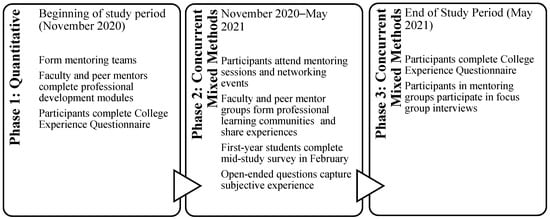 We employed the College Experience Questionnaire (CEQ) and Mentoring Survey. The CEQ [,] is a 21-item questionnaire that includes three subscales: university environment, connectedness, and alienation, and is designed to assess graduate students’ sense of belonging and connectedness with an acceptable internal consistency (Cronbach’s α 0.78) []. Students in the intervention and comparison groups completed the CEQ electronically at the beginning (November 2020) and end of the study (May 2021). Participants completed mid- and end of study surveys developed during the pilot study [] to track the dosage of the intervention received. The surveys were designed to collect data on the number of mentoring sessions received and number of networking events attended. There were also open text fields for student comments about the mentoring intervention.