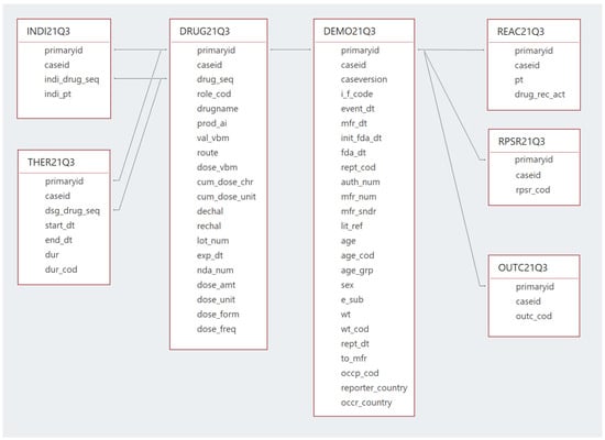 The REAC file provides the adverse drug reactions, where it includes the “P.T.” field or the “Preferred Term” level terminology from the Medical Dictionary for Regulatory Activities (MedDRA) [20], as it is used as the medical descriptor of the adverse drug events used in FAERS/LAERS. The INDI file contains the drug indications, which also uses the “P.T.” level of MedDRA as a descriptor for the drug indication. The OUTC file provides information on the outcomes of the cases, the THER file gives the start and end dates of therapy, and finally, the RPSR file contains the sources of the reported events. For each report in the DEMO file, at least one report must be available in the DRUG file and one report in the REAC file, while other files do not always have information on each case report in the DEMO file. All these files are linked together to form one database through a common primary key, which is the “ISR” for the period of January 2004 to September 2012 (i.e., LAERS) and the “primaryid” since October 2021 (i.e., FAERS).