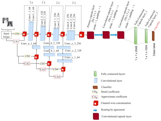 As shown in Figure 1, the wavelet function generates the high frequency constituents (detailed) of the disintegrated image, whereas the scaling function generates the low frequency constituents (approximate). The frequency constituents of detail and approximates are extracted via a filter bank comprising high pass and low pass filters. For each stage of decomposition, the wavelet is scaled by a factor of two. To obtain more information about the input image, the low frequency constituent is decomposed again. The beginning section of the right side is a projection of in the scaling space, with coefficients representing image ’s discrete smoothing approximations, and the other section is a projection of in the wavelet space, with coefficients representing image ’s discrete informative features of the image, which are the wavelet transform coefficients. In image processing applications, wavelet multi resolution analysis is widely used and efficient. This paper combines the technique of multi-resolution analysis of discrete wavelet transform and capsule network for COVID-19 classification task, as illustrated in Figure 1. For the image input, the discrete wavelet transform (DWT) is presented numerically in Equations (7) and (8).