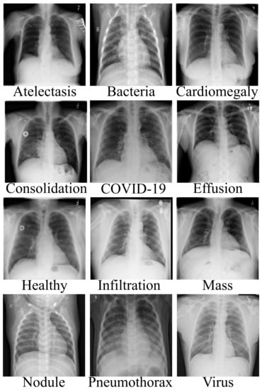 - Wang, X.; Peng, Y.; Lu, L.; Lu, Z.; Bagheri, M.; Summers, R.M. ChestX-ray8: Hospital-scale chest X-ray database and benchmarks on weakly-supervised classification and localization of common thorax diseases. In Proceedings of the IEEE Conference on Computer Vision and Pattern Recognition, Honolulu, HI, USA, 21–26 July 2017; pp. 2097–2106. [Google Scholar]