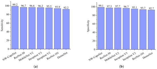 Comparison report of our model and selected pre-trained models. (a) Sensitivity result of the pre-trained models, including our proposed NW-CapsNet model. (b) Specificity result showing that our proposed model outperforms the selected pre-trained models.