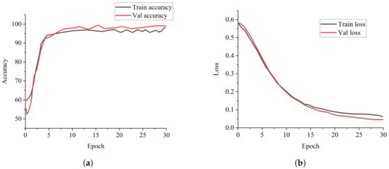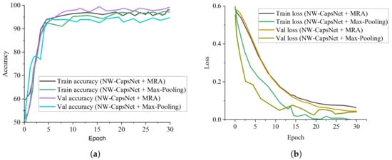 Training and validation curves for the proposed model. (a) Accuracy curve showing the performance of our proposed NW-CapsNet model. (b) The loss curve of our proposed NW-CapsNet model showing the stability of our model.