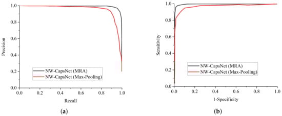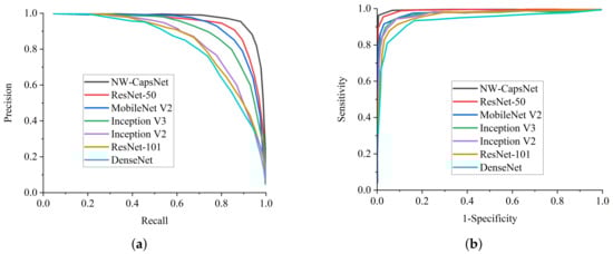 Finally, we compared our proposed model with some pre-trained deep learning methods in terms of precision–recall and ROC, as seen in Figure 8a,b. It is worth mentioning that all of the models are trained on the same dataset for fair comparison. We only modified the last layer of the models to correspond to the number of class labels in our dataset. From all indications, our proposed NW-capsNet outperforms the other models in terms of precision–recall and ROC. The precision–recall graphs show that the curves of our proposed model is the closest to the upper right corner of the graph with the largest area, and therefore has a higher precision associated with a higher sensitivity. Similarly, the ROC graphs indicate that the curves of our proposed model are the closest to the upper left corner of the graph, with the largest area under the curve, and therefore has a higher sensitivity associated with a higher specificity. More importantly, as mentioned above, the stated result in terms of the receiver operating characteristic (ROC) and precision–recall can assist expert radiologists in striking a balance between accuracy and precision.