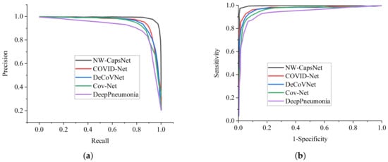 Performance comparison with state-of-the-art models. (a) Precision–recall curves of our proposed NW-CapsNet model in comparison to some state-of-the-art COVID-19 methods. (b) ROC curve of our proposed NW-CapsNet model in comparison to some state-of-the-art COVID-19 methods.