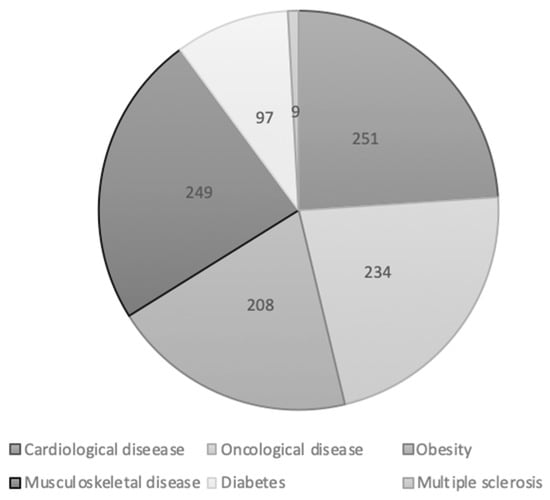 The most common chronic conditions in the study group were cardiological disease, oncological disease, musculoskeletal disease, and obesity. Diabetes and multiple sclerosis were present to a lesser extent. Many people were affected by multiple diseases, but they were asked to indicate the dominant disease for which they had been prescribed pharmacotherapy (Figure 1).