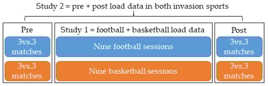 Study 2. The students played 3 vs. 3 matches with three players per team (n = 120), performing a five-minute warm-up. Each of the teams played against each of the other teams in this game situation. All matches were played on mini-fields. A fair balance between the teams was sought, and the teams were mixed by gender and experience. In all matches, the 3 vs. 3 game situation involved the same subjective eTL known to the teachers. A 3 vs. 3 session was performed for each sport, pre- and post-intervention (Study 1). In the soccer matches, there was no goalkeeper (with mini-goals) because their demands differ from those of field players []. The RPE was measured just after each match. For Study 2, the intensity data from all 3 vs. 3 matches were pooled.