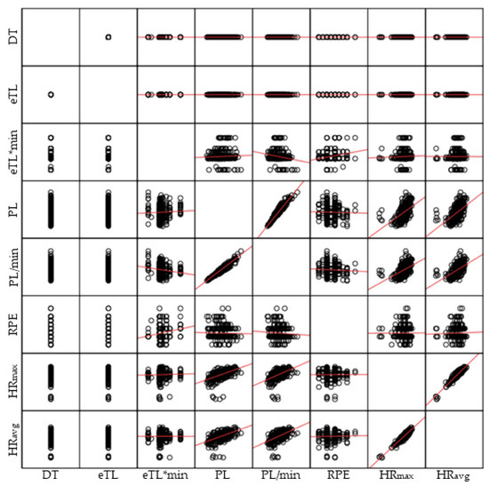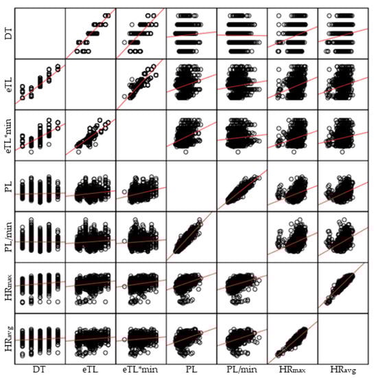 Study 2. The matrix scatter plots between the intensities studied (in pairs) are shown in Figure 4. These indicate that the possible correlations follow a positive/increase trend, except for the variables: eTL*min and PL/min (negative correlation).