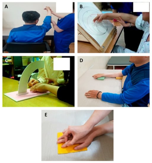 29]. The therapy included passive joint exercises to reduce the spasticity of the upper extremity muscles and joints affected by stroke, as well as active joint exercises such as small muscle activity using different tools, micro-movement training, and two-handed exercises. Neurodevelopmental treatment and pain management were provided according to the patient’s level of recovery. ADL, including wheelchair operation, climbing up and down stairs, functional movement, eating, dressing, and personal hygiene, were assessed. Depending on the level of recovery of the participant, 2–3 tasks were selected and performed.