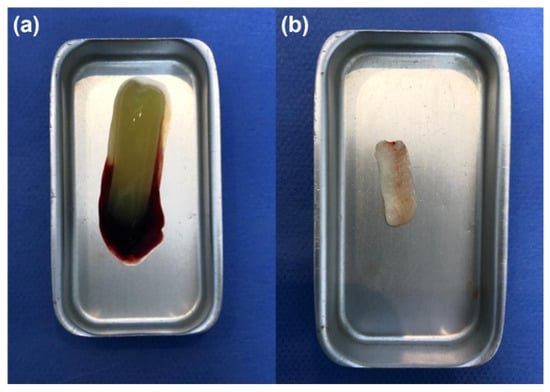 - Aminabadi, N.A.; Parto, M.; Emamverdizadeh, P.; Jamali, Z.; Shirazi, S. Pulp bleeding color is an indicator of clinical and histohematologic status of primary teeth. Clin. Oral Investig. 2017, 21, 1831–1841. [Google Scholar] [CrossRef]