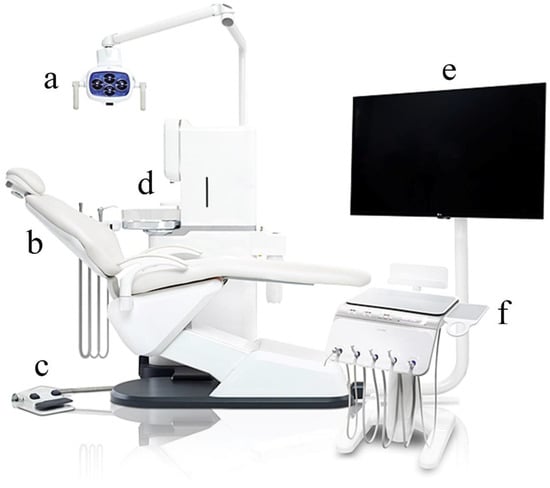 In dental clinics, the use of a dental unit chair is essential for the diagnosis and treatment of patients [1,2,3]. Dentists spend most of their office hours in the dental unit chair space for patient care [4,5]. In addition to dentists, patients and dental hygienists also use the dental unit chair [6]. The dental unit chair consists of the following components: the light, patient seat, foot controller, water fountain and cuspidor, monitor, bracket table and controller, and dentist chair (Figure 1).